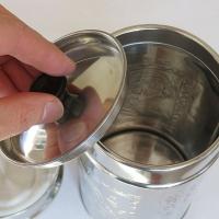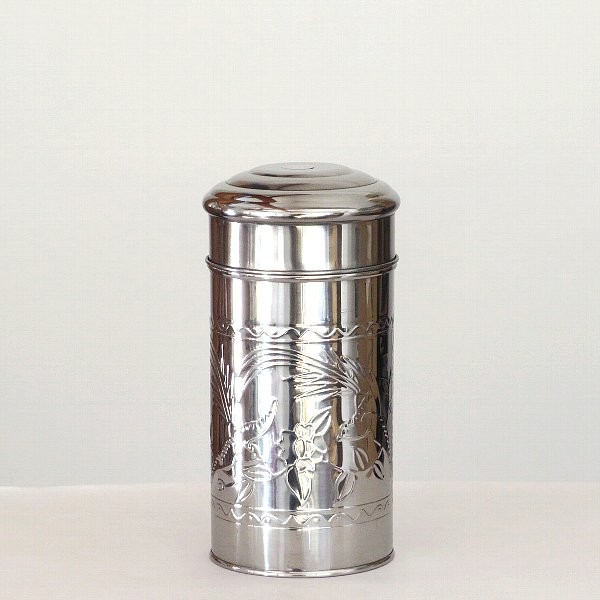 縦に長い、筒型タイプのステンレス茶缶。中蓋がついているので茶葉の保存も安心。