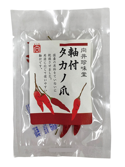 ◎国産タカノ爪の中から小粒で形の良いものを選び、軸付のまま仕上げています。風味豊かで、つやのある緑と赤の色合いがお料理に美しい彩りを添えます。