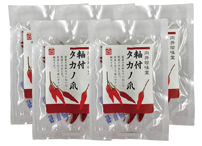 ◎国産タカノ爪の中から小粒で形の良いものを選び、軸付のまま仕上げています。風味豊かで、つやのある緑と赤の色合いがお料理に美しい彩りを添えます。