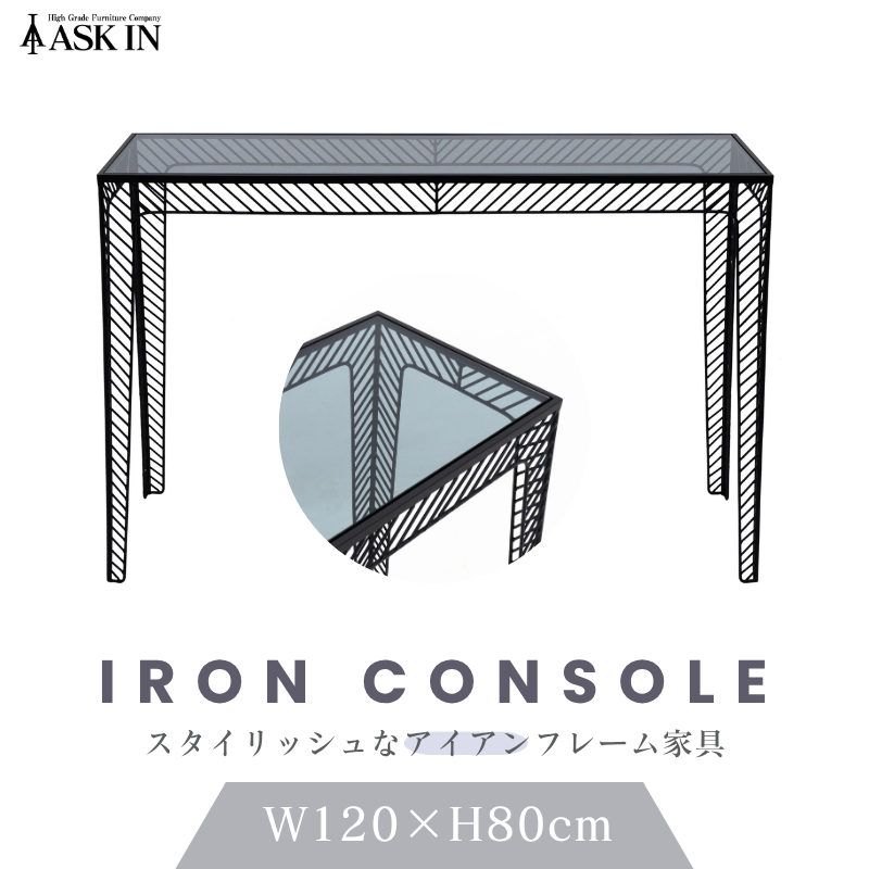 テーブル アルバコンソール 机 幅120×奥行35×高さ80cm アイアン インダストリアル 飾り棚 モダン ガラス 鉄 本棚 ASK IN アスクイン