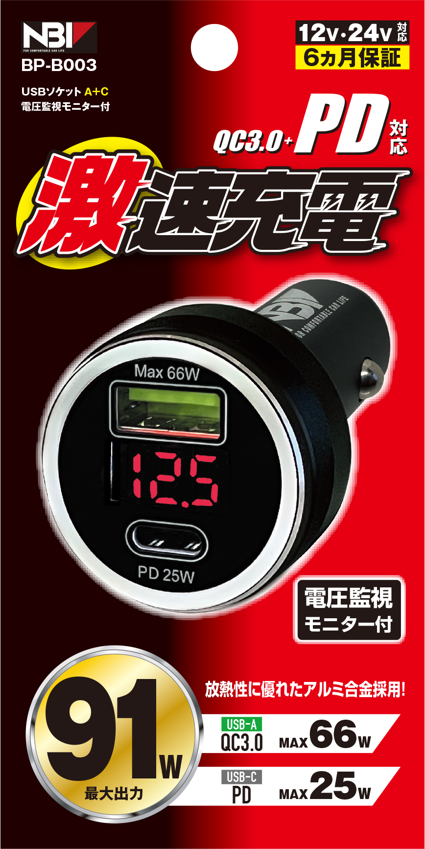 車用充電器 激速充電 USBソケット A+C 電圧監視モニター付き (BP-B003)