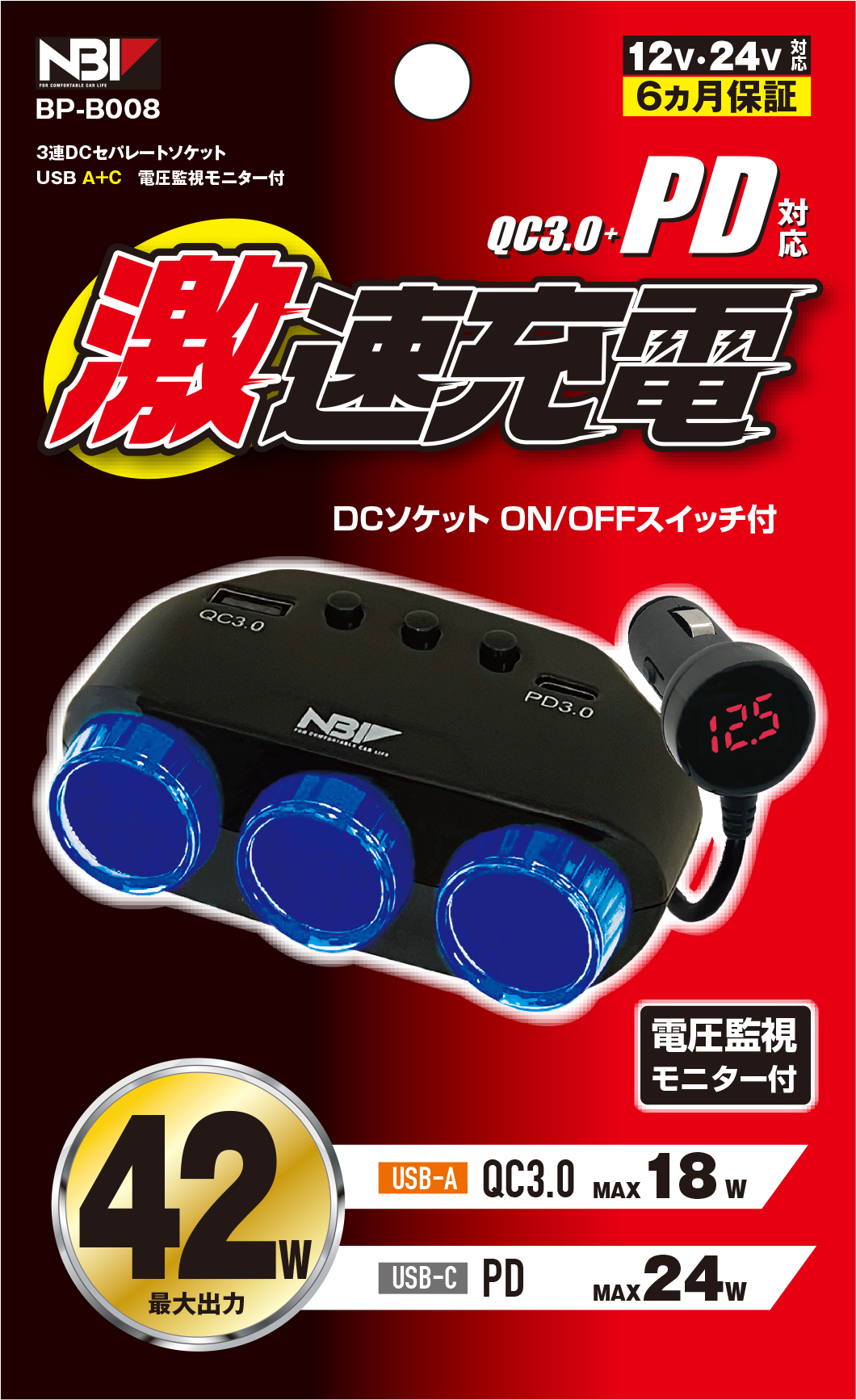 車用充電器 激速充電 3連DCセパレートソケットUSB A+C 電圧監視モニター付き (BP-B008)