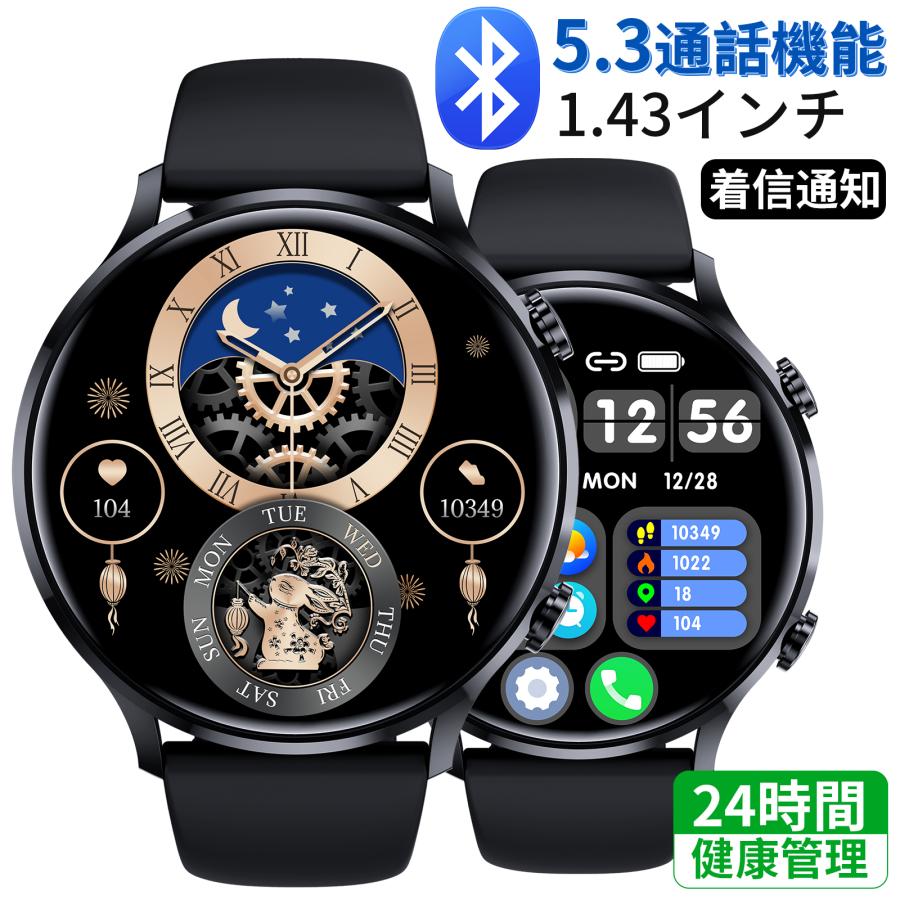 スマートウォッチ 1.43インチ大画面 通話機能 腕時計 着信通知 生活防水 iphone android対応 丸型 プレゼント 母の日