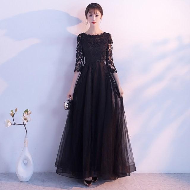 イブニングドレス 50代 40代 30代 ロングドレス 黒 レース チュール エレガント ロング丈 パーティードレス 宴会 二次会ドレス 7分丈袖