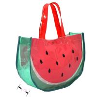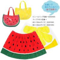 スイカの型にカットされた かわいい ビニールトート 。プール 海 温泉 などマチがあるのでタオルや水着、着替えなどもたっぷり入ります。上部にはワンボタン付きで中身が飛び出しずらくなっています。