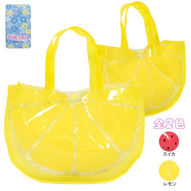 レモンの型にカットされた かわいい ビニールトート 。プール 海 温泉 などマチがあるのでタオルや水着、着替えなどもたっぷり入ります。上部にはワンボタン付きで中身が飛び出しずらくなっています。