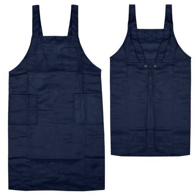 胸はペンがさせるポケット付き。ウエストは調節可能のボタン留め。肩ヒモは調節不可。