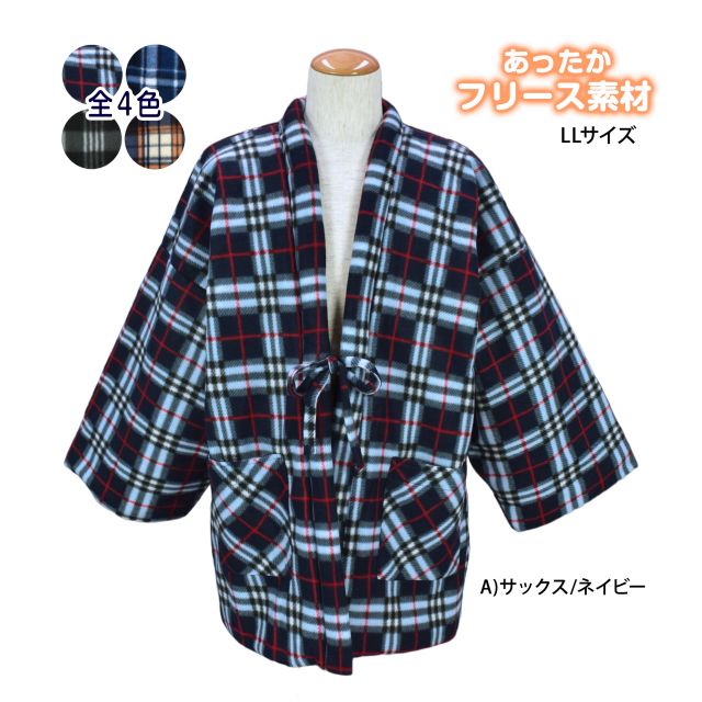 ||||▼ 商品説明||男性用 大きいサイズ フリース 中綿入り はんてん 。||表地はフリースの チェック柄 裏地はキルティング。ポケット は前に2つ。共布のひも付き。半天 を着ると、寒い時期には暖かく快適に過ごせます。冬はお家にいる時間も長くなりがちなので、暖かな 半纏 がおすすめです。||※模様や柄の出方は個々の商品によってそれぞれ異なります。||※生産ロットの違いにより裏地の色が異なる場合があります。|| カラーはお選び出来ませんのご了承願います。||||※ ジュニア スクール 男子 男の子 男性 紳士 シニア 大人用||※ 部屋着 リラックスウェア ルームウェア 羽織 袢纏 ちゃんちゃんこ 丹前 アウター||||||▼ 配送方法||この商品は佐川急便宅配便利用で送料無料となります。||ご注文時には送料が表示されますが当店での正式受注時に訂正させて頂きます。||【注意事項】||※他の商品との同梱の場合も規定サイズ内であれば送料無料にて承ることが可能です。|| 規定サイズを超えた場合や沖縄県や離島・遠隔地への配送等、佐川急便宅配便が利用できない場合は実費から割引でのご対応となります。||※代引手数料はお客様ご負担となります。||||▼ サイズ説明||