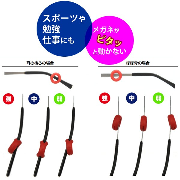 眼鏡のツルに装着し、眼鏡がずれないよう固定するためのリングです。眼鏡がすぐにずれてしまう方や、スポーツをする時などに「ピタッ」とフィットして、ぐらつきを防止します。 メガネのツルの後ろから入れて、ご自由な位置で固定してご利用ください。