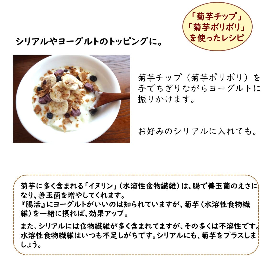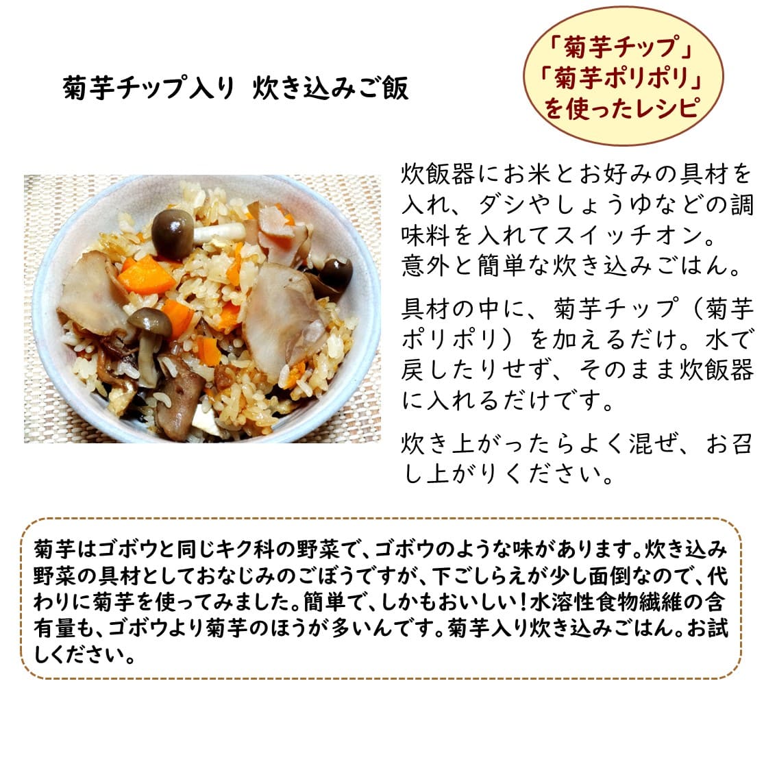 エネルギー 約130kcal、たんぱく質 約2.6g、脂質 約0.4g、炭水化物 約30g(うちイヌリン 約18〜21g)、食塩相当量 0g