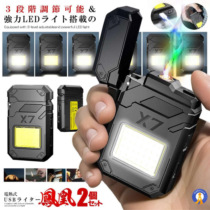 2個セット USB電熱ライター 鳳凰 LEDライト 3段階調節可能 強力 タバコ 喫煙 煙草 照明 作業灯 KARARAI