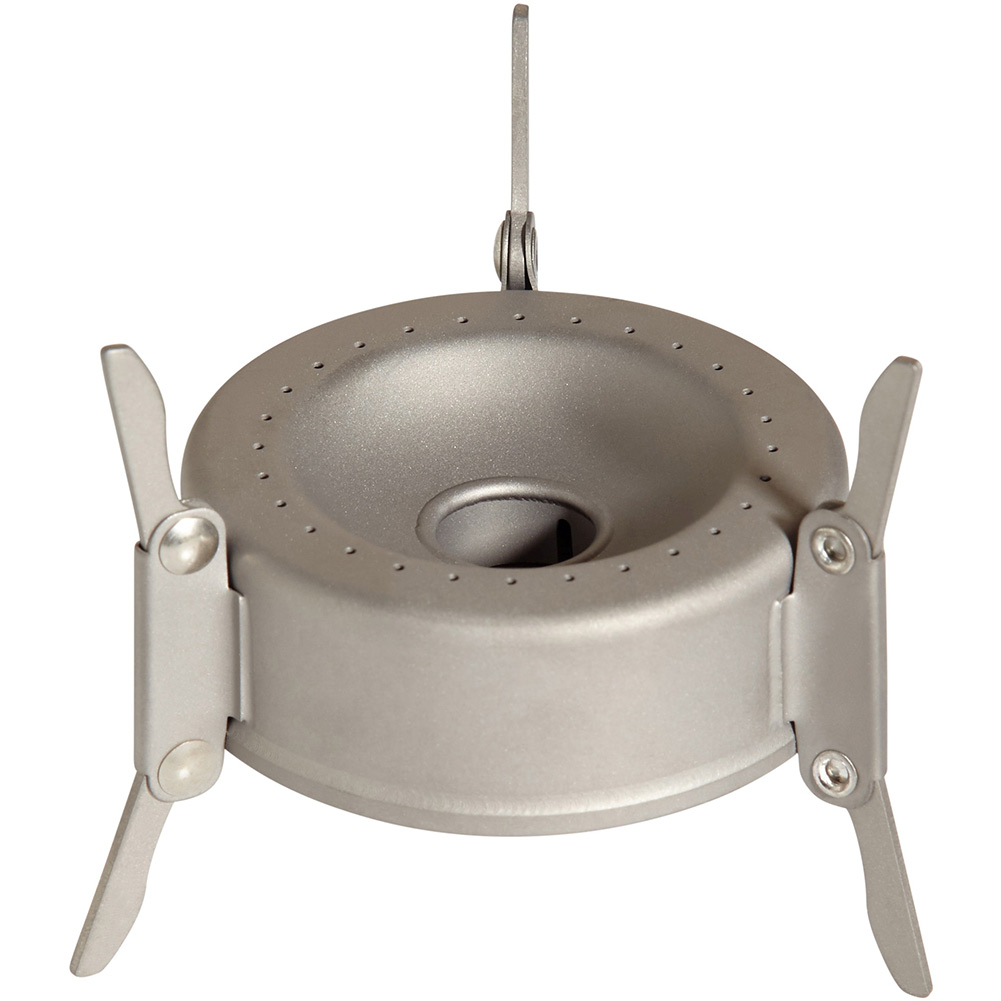 連続燃焼時間約20分。500ccの水を約5,6分で沸かします。アルコール、固形燃料、燃料ジェルでの使用を可能にしたストーブ。親切な五徳付き。残ったアルコールは五徳を使用してアルコールボトルへ戻すことが可能です。