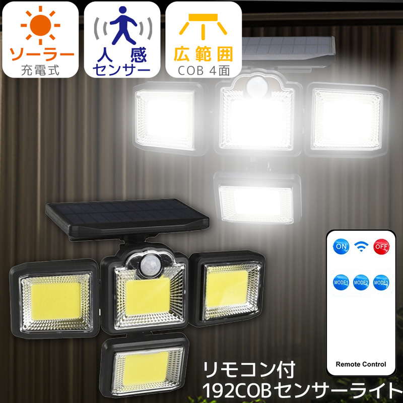 センサーライト 屋外 ソーラーライト 充電式 リモコン付き LEDライト 人感センサー 防水 4面発光 壁掛け夜間常時点灯モード搭載 角度調節可能