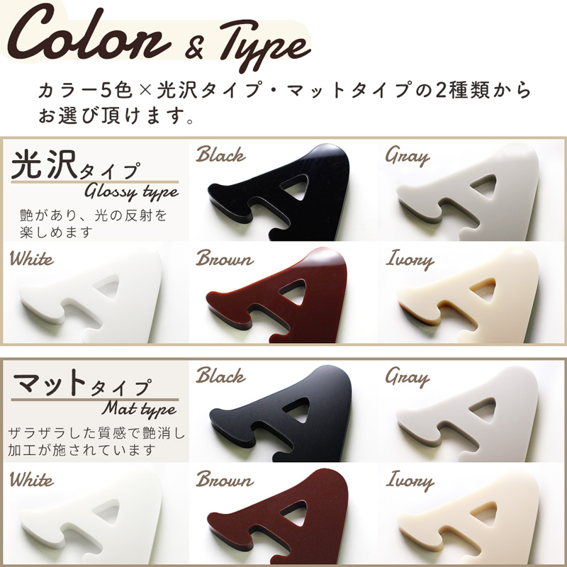光が反射する光沢タイプとザラザラとした質感で艶消し加工が施されたマットタイプの2種類があり、カラーは5色からお選びいただけます