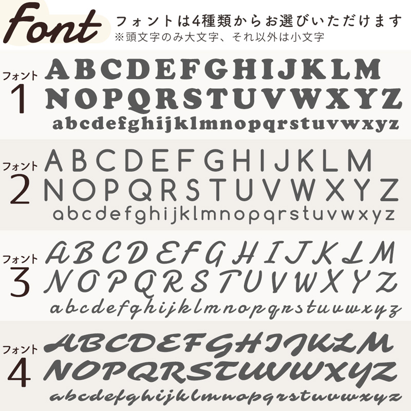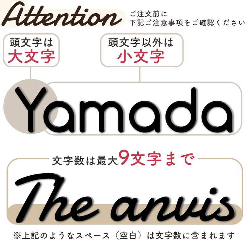 ・入力時に全て小文字や大文字でご指定いただきましても製作できませんので頭文字のみ大文字に変更し、製作させていただきます。