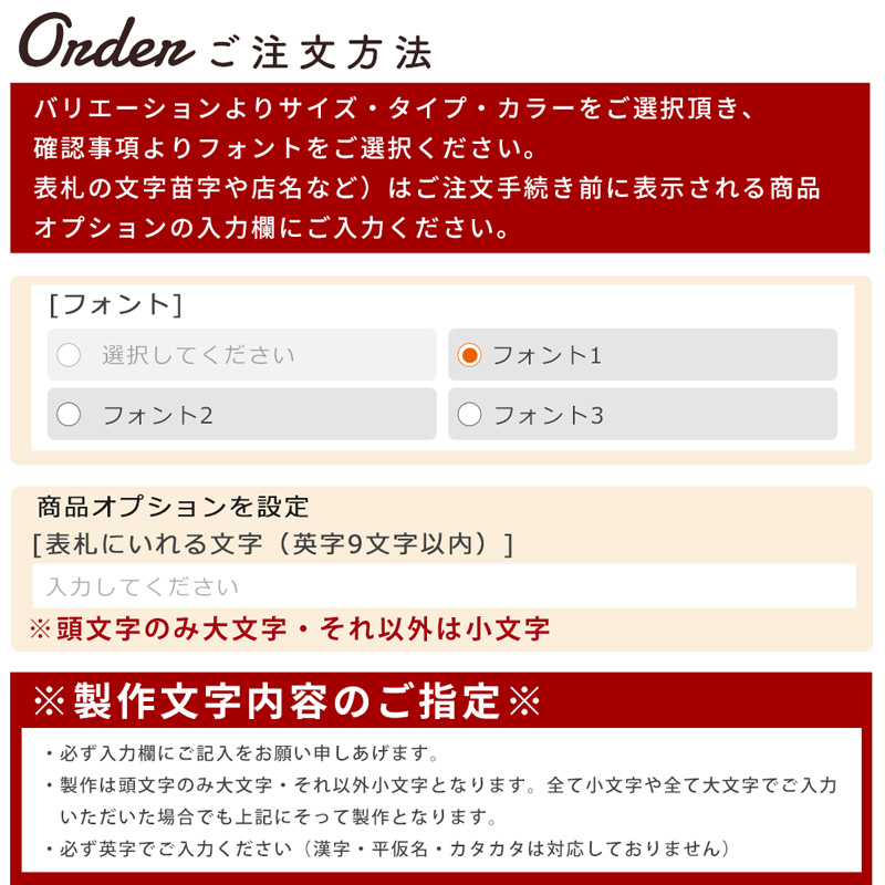 ・表札にお入れする文字(苗字や店舗名・メッセージなど)は入力欄にご入力お願いします。