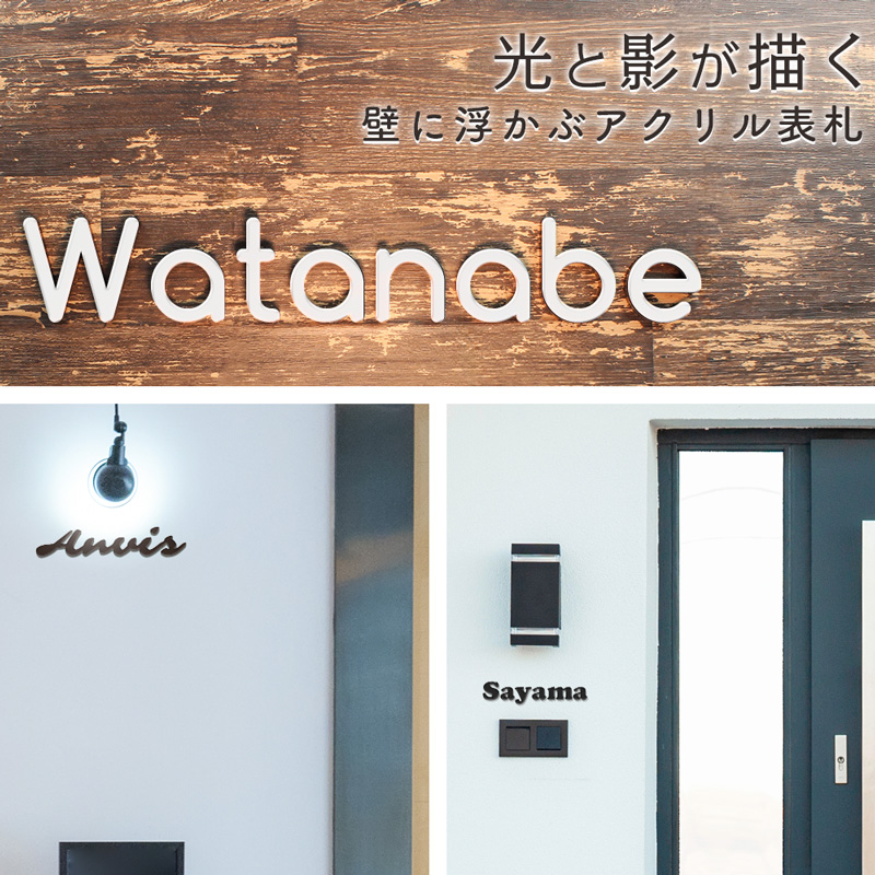 光と影が描く【壁に浮かぶアクリル表札】立体的なアクリル切り文字タイプのAnvis製表札です