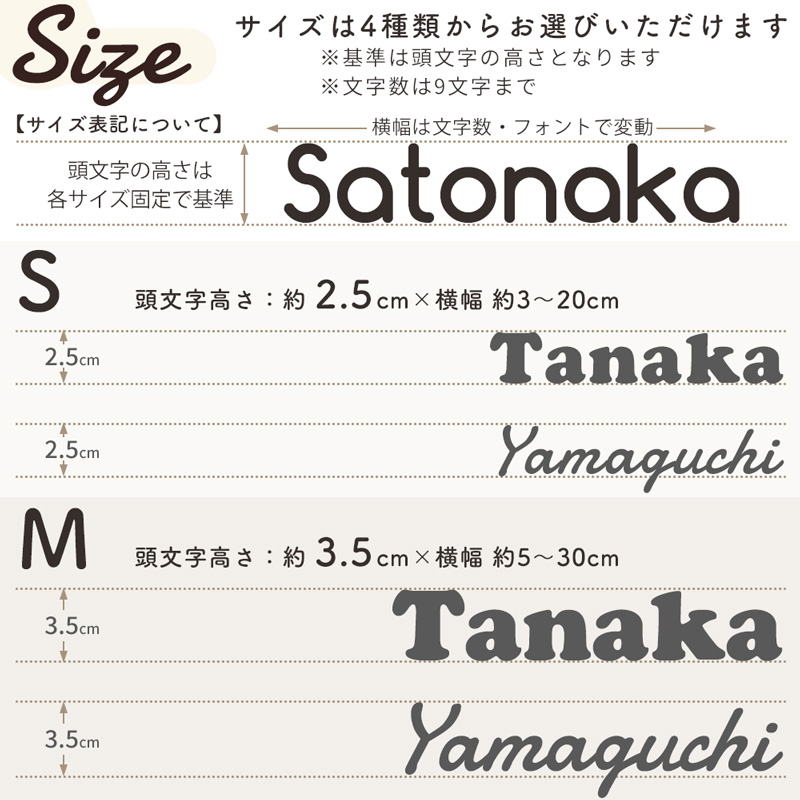 サイズは4種類/基準は頭文字の高さとなり、横幅は文字数やフォントで変動します