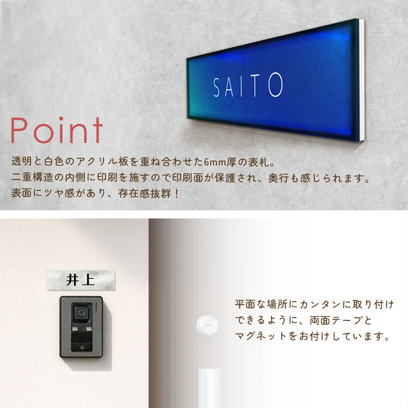 ご自宅のドア、マンション、会社などのネームプレートに!クリアアクリルとベース(ホワイト)アクリルを重ね合わせたカラーアクリル表札 細長 長方形タイプです。