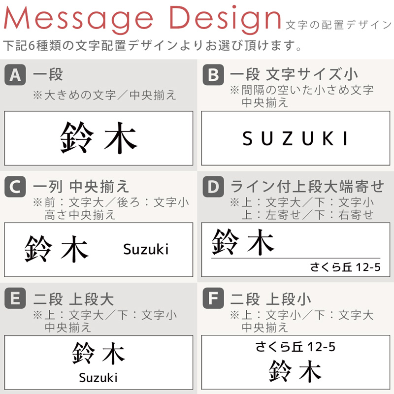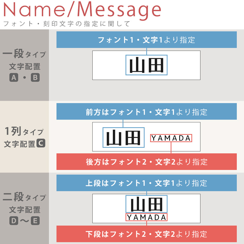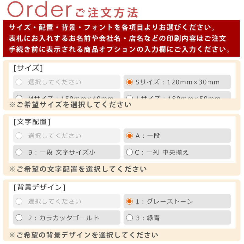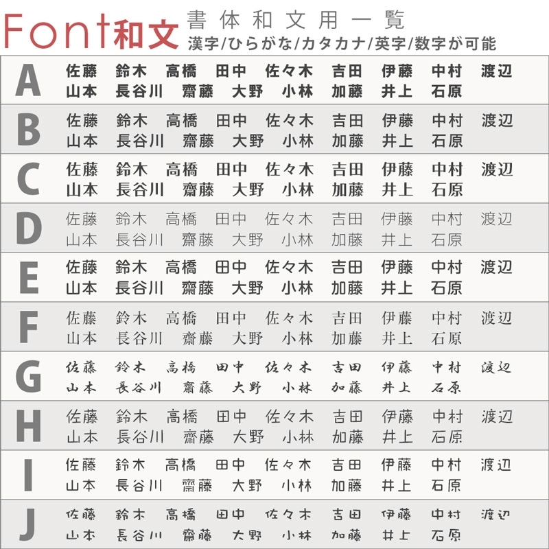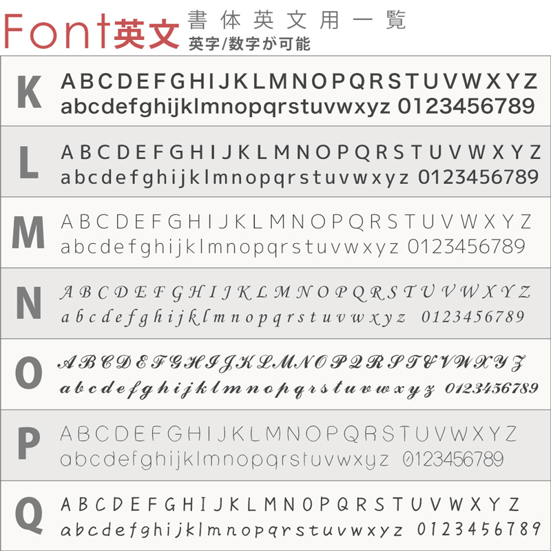 デザインだけでなく、フォント(書体)17種類、サイズは4種類から組み合わせていただけます。