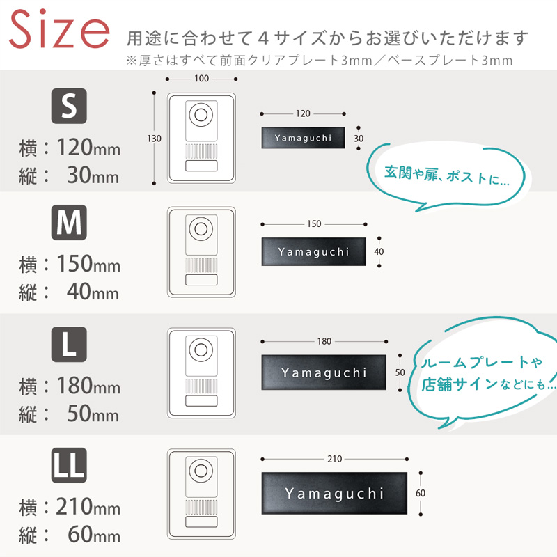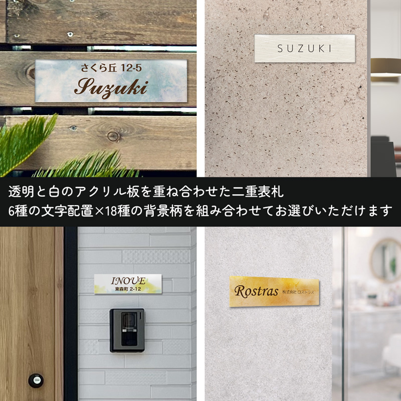 透明のアクリルの内側に印刷を施すので印刷面も保護され、透明のアクリルによって奥行も感じられる表札です。