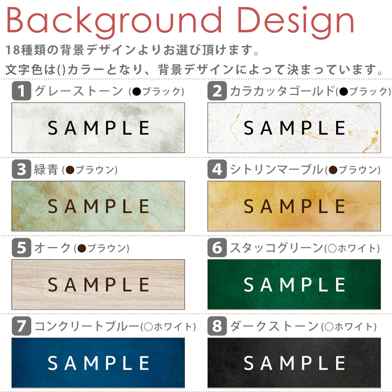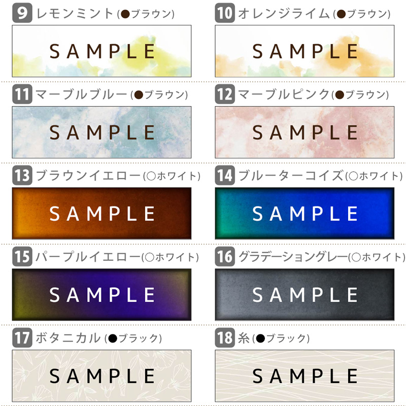 シンプルな18種類の背景柄と6種の文字配置を組み合わせてお選びいただけます。