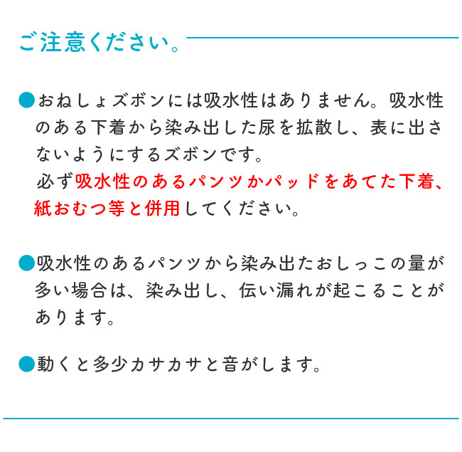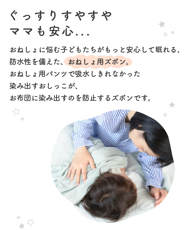 吸水性のあるおねしょパンツや紙おむつから染み出るおしっこで、お布団が濡れないよう、おしっこの染み出しを防止する防水布付きズボンです。
