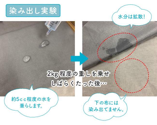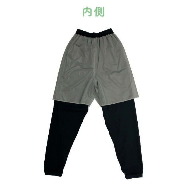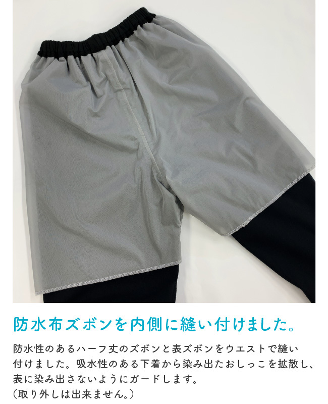 水分を拡散し、染み出さない素材を使用したハーフ丈のズボンを、綿100%の表ズボンとウエストで縫い合わせました。