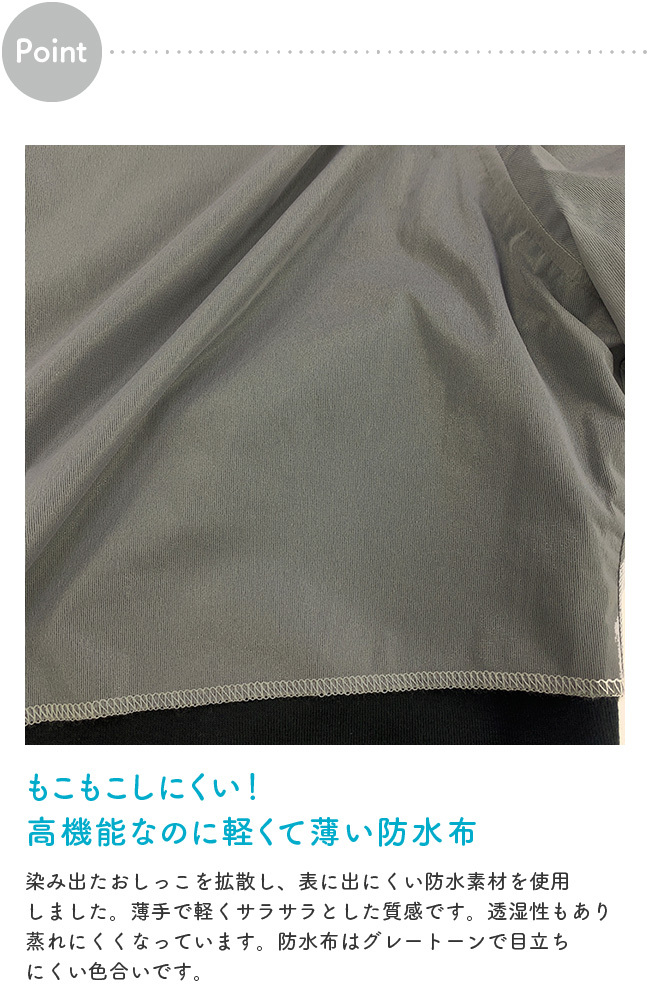 睡眠を妨げないよう、防水性がありながらも薄くて軽い防水布を使用しました。お尻まわりがもこもこしにくく、すっきりとした着用感です。透湿性も備えているので、蒸れにくくなっています。