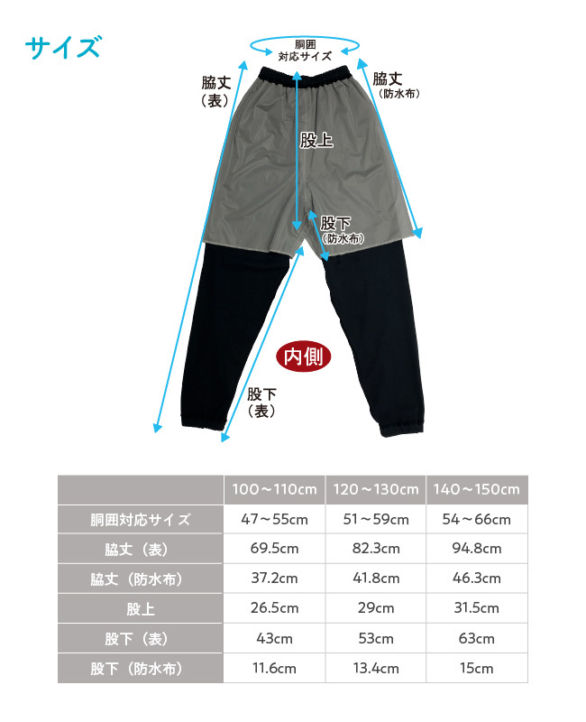防水布ズボンと本体のズボンはウエストで縫い合わせているので、お洗濯時は内側のズボンを外に出して干すと乾きが早くなります。