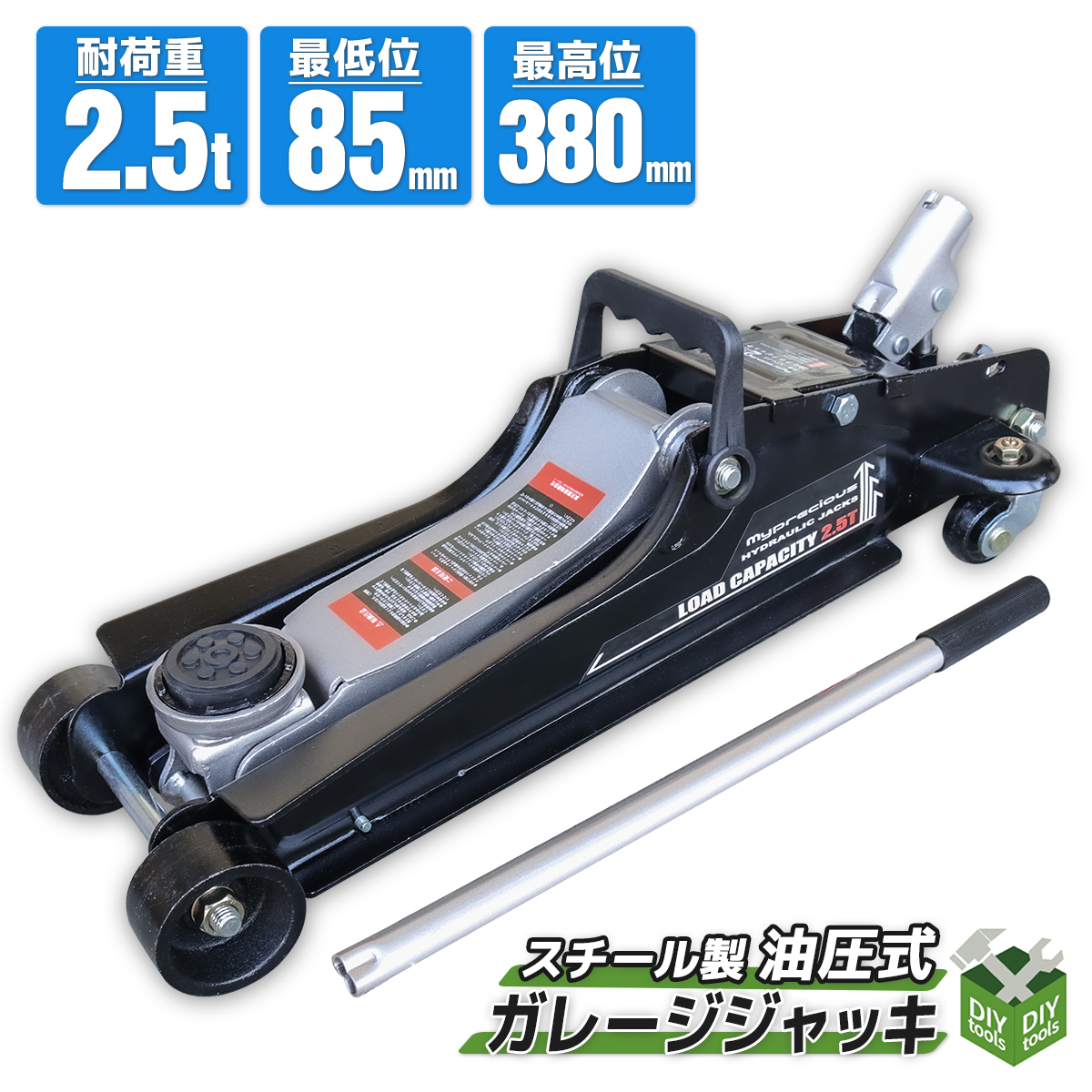 油圧式 ガレージジャッキ 2.5t ローダウン スチール製 低床 ジャッキ 最低位85mm 最高位380mm タイヤ交換 メンテナンス コンパクト設計 車修理