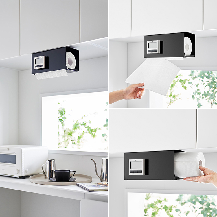 片手でカットできるカバー付きの戸棚下キッチンペーパーホルダー。
