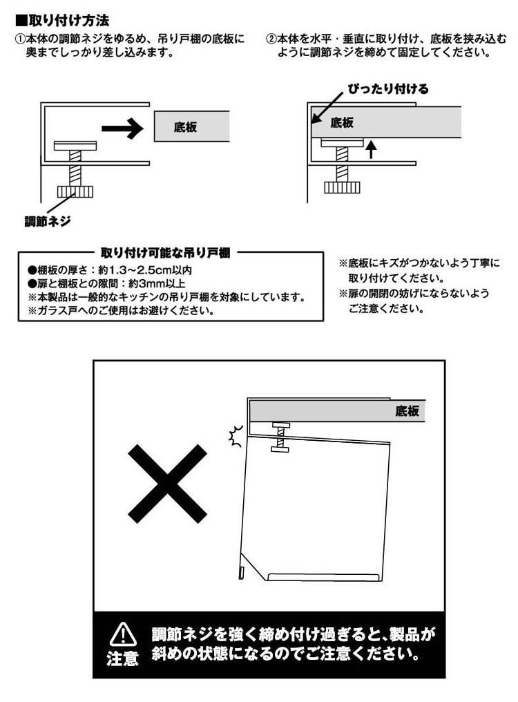 調節ネジで戸棚下にしっかり固定。