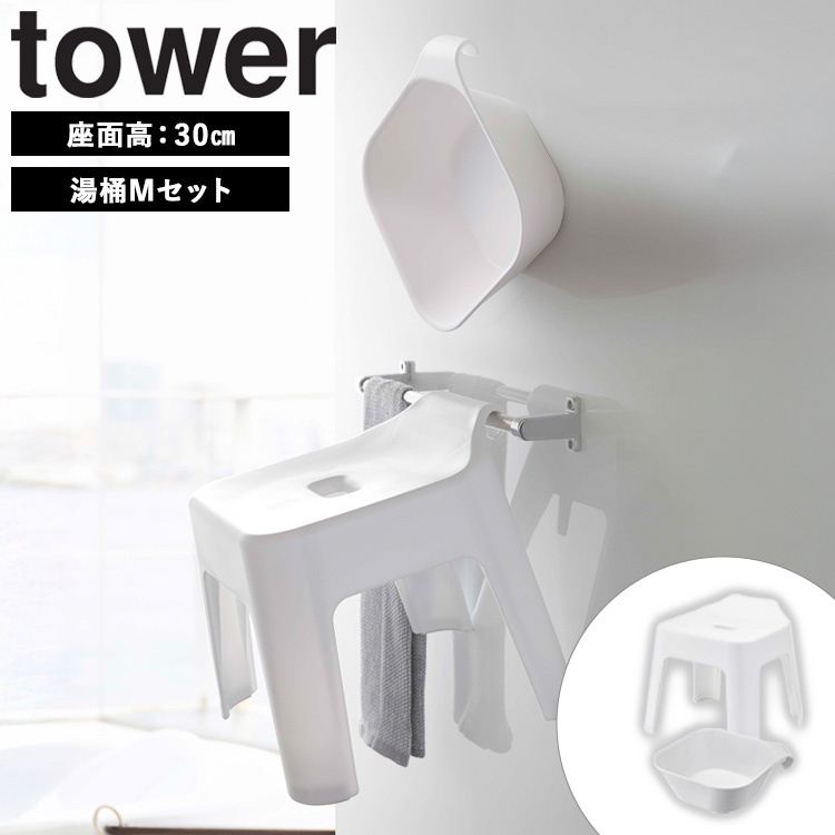 山崎実業 tower タワー 引っ掛け風呂イス タワー 座面高30cm 【湯桶Mセット 】 風呂椅子 風呂いす バスチェア 浮かせる 衛生的 湯桶 湯おけ ホワイト