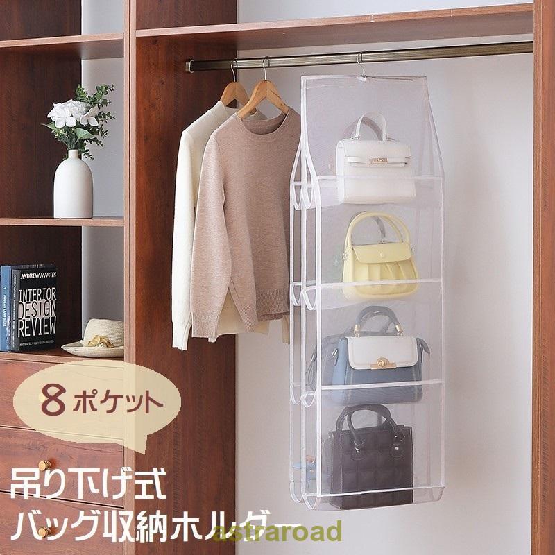 バッグ収納 ハンガー式 吊り下げ 4段 両面 かばん収納 バッグホルダー 折りたたみ可 フック メッシュ 通気性 透け感 シアー クローゼット収納 収