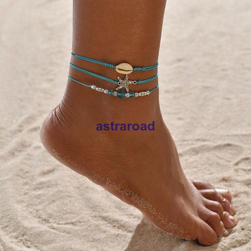 アンクレット レディース アクセサリー 3本セット 貝殻 貝がら シェル ビジュー 星 おしゃれ ギフト ターコイズブルー