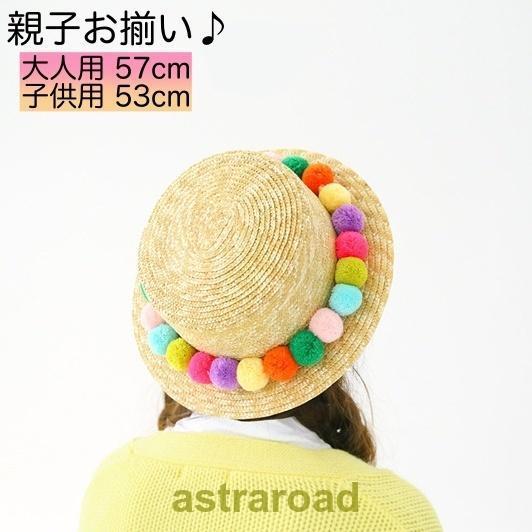 麦わら帽子 ストローハット カンカン帽 レディース 大人用 女性 キッズ 子供用 女の子 親子 お揃い ペアルック ボンボン カラフル 紫外線対策 日 夏