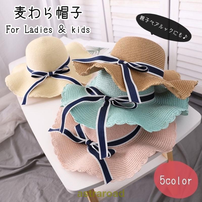 麦わら帽子 ストローハット レディース 女性 キッズ 女の子 親子ペアルック お揃い リボン 丸形 無地 ピンク カーキ オフホワイト キュート かわ 夏