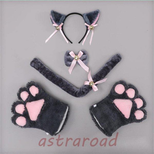 猫コスチューム 衣装 鈴付き ネコ耳カチューシャ 首輪 しっぽ 肉球手袋 4点セット ハロウィン仮装 学芸会 女子会 イベント