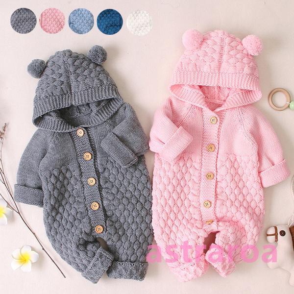 ロンパース ベビー 着ぐるみ ニット 赤ちゃん用ロンパース フード付き 女の子 男の子 ポンポン オーバーオール 幼児 子供服 可愛い カバーオール おすすめ