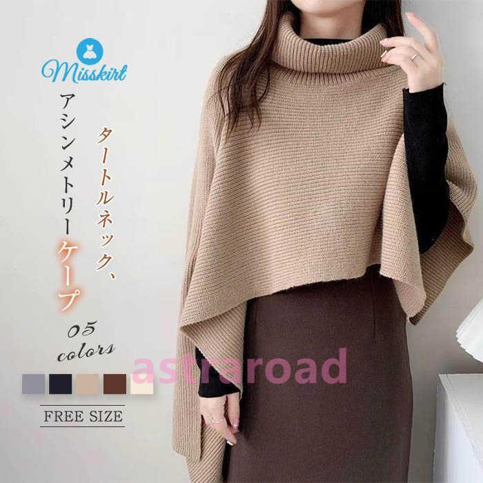 ニット セーター ケープ マント レディース トップス 秋 冬 コート ニットセーター 長袖 無地 ハイネック アシンメトリー プルオーバー ショート ニットソー 切