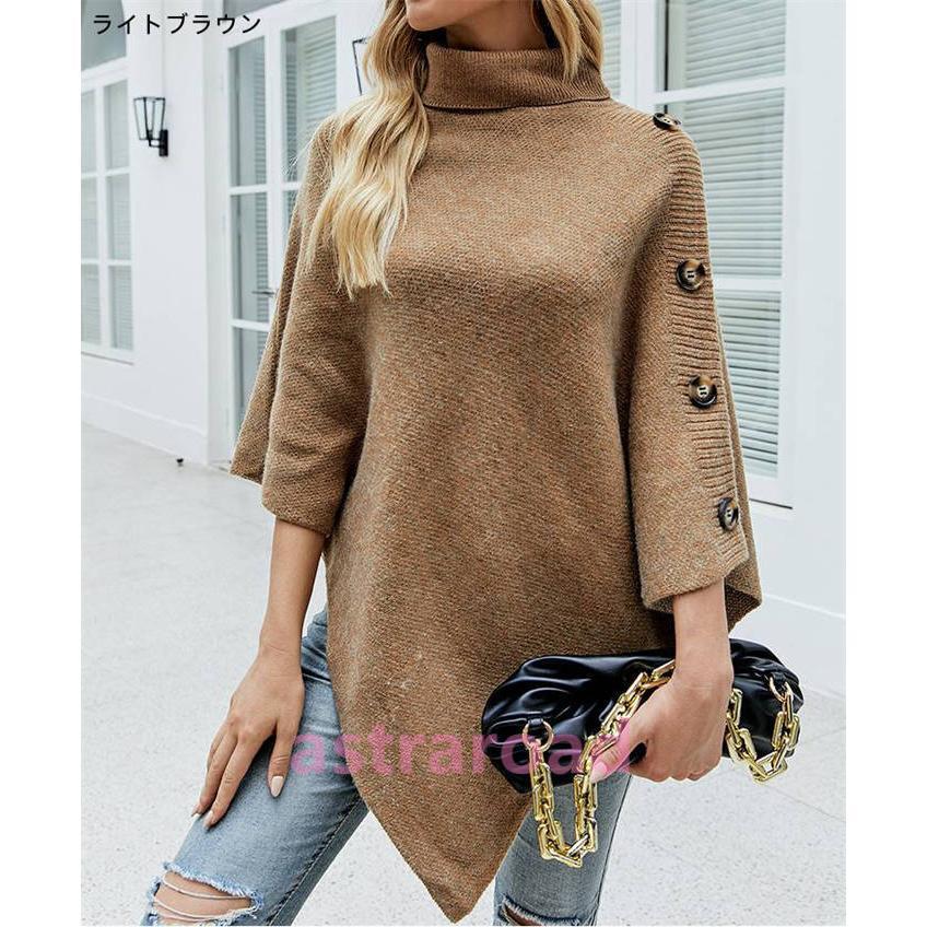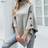 ニット セーター ケープ レディース 無地 ハイネック 厚手 マント トップス 五分袖 プルオーバー アウター コート 秋 冬 ニットセーター ボタン デザイン感 通勤