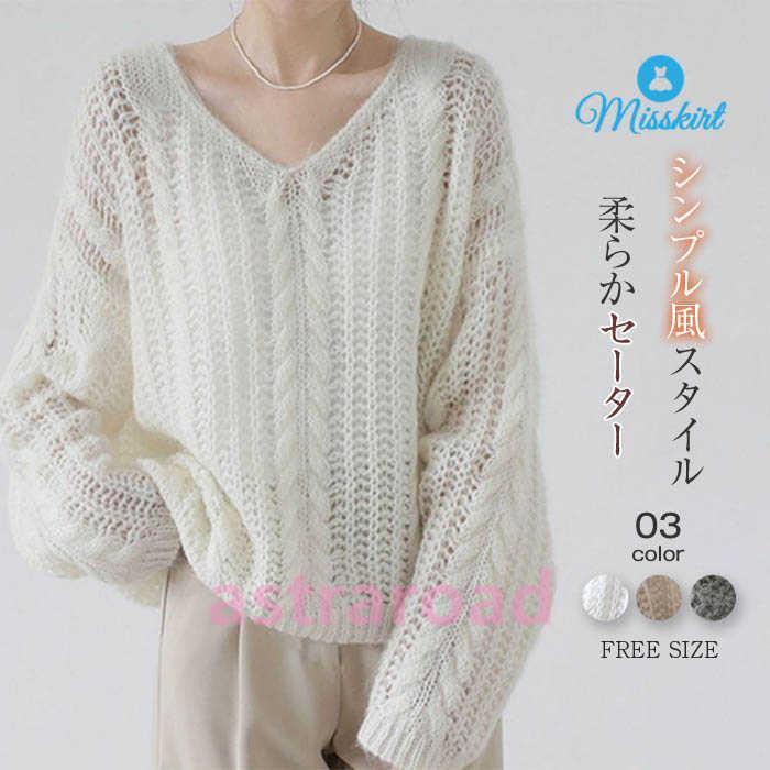 ニット セーター カットソー レディース 透かし編み 春 秋 新作 長袖 トップス 薄手 プルオーバー Vネック ガーリー 無地 透け感 カジュアル おしゃれ ゆったり
