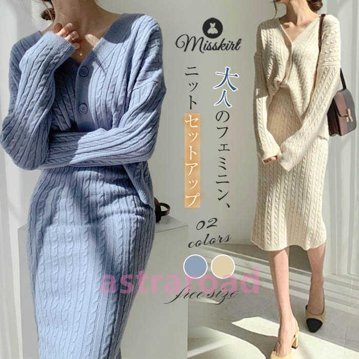 セットアップ ニット スカート レディース 2点セット 上下セット セーター カーディガン ニットセットアップ ニットスカート タイトスカート 前開き リブニット