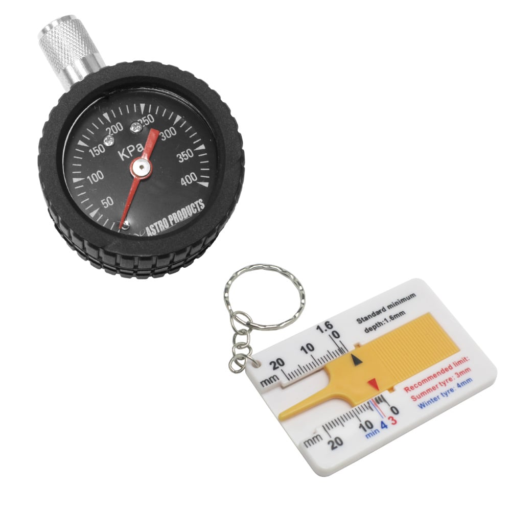 小型で携帯にも便利な米式バルブ用のエアタイヤゲージと、タイヤ溝の深さを測ることができる簡易的なゲージのセットです。