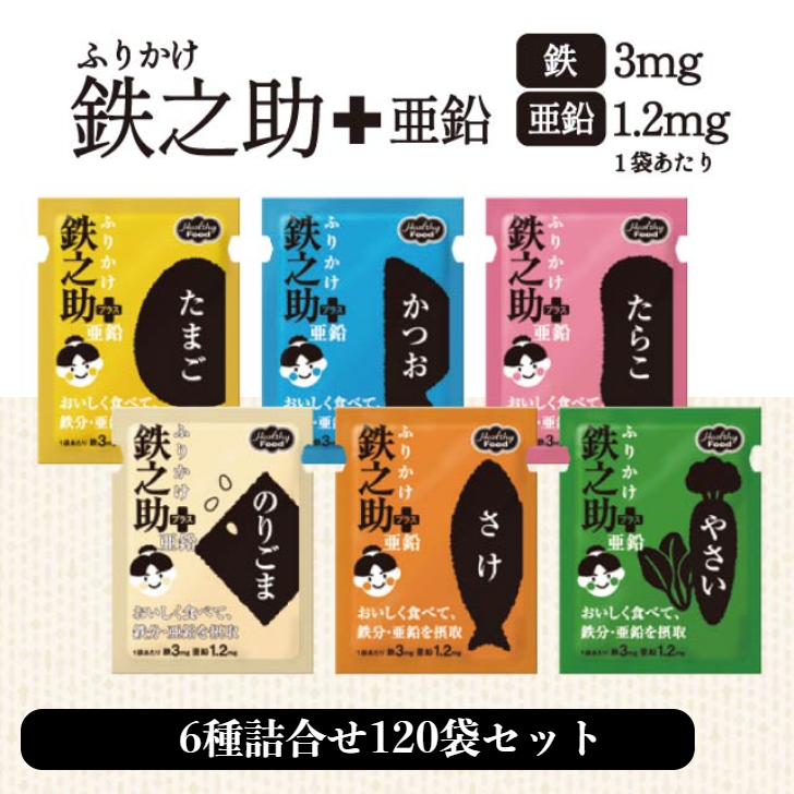 ヘルシーフード ふりかけ鉄之助 + 亜鉛 6種詰合せ( たらこ・のりごま・かつお・さけ・たまご・やさい )3g×6種×10袋 合計120袋セット ふりかけ 鉄分 子供 介護