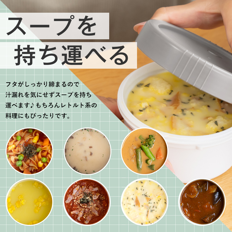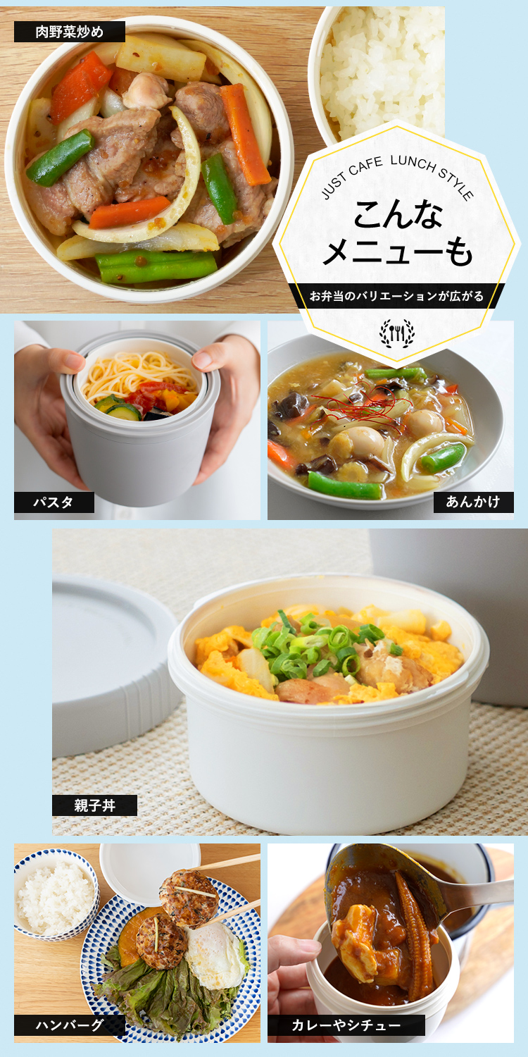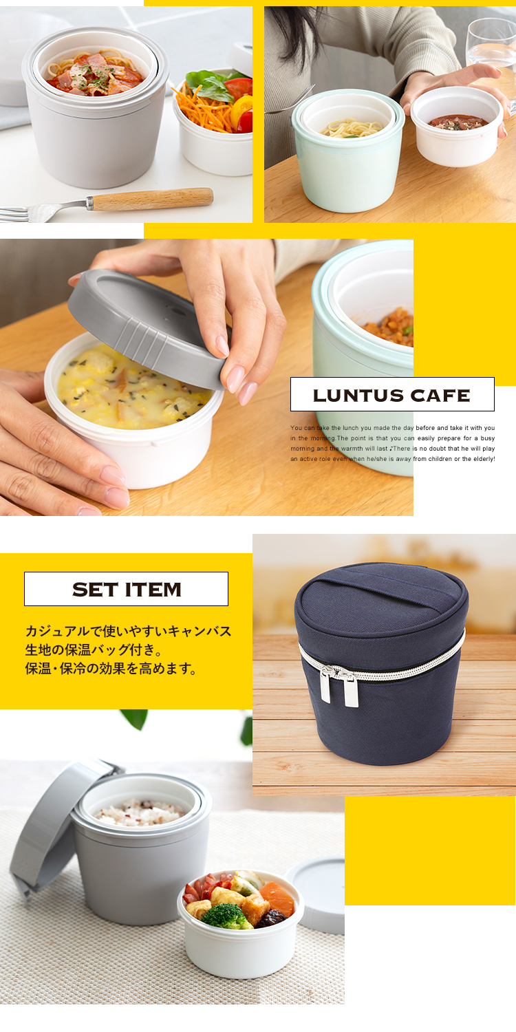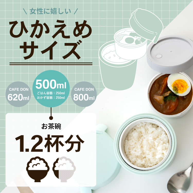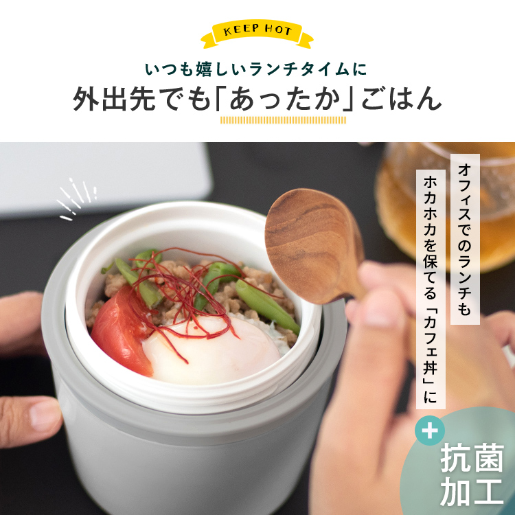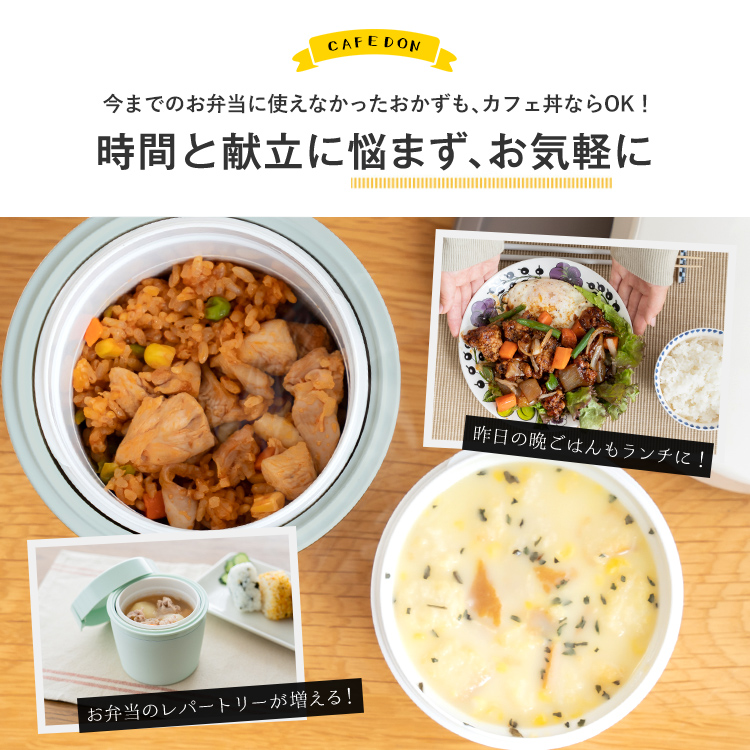 いつでもどこでも温かご飯が美味しく食べられるカフェ丼ランチ。ステンレス真空断熱構造で、保温・保冷で、中身の温度を保ちます。丼タイプなので、カレーや親子丼、パスタなど、お弁当のバリエーションが広がります。保冷もできるから、暑い夏にも冷製メニューにも。丼ぶり形状で、お子様でも食べやすく、おかずも詰めやすいので、お父さんお母さんも大助かり。食洗器にも対応、忙しい家事の短縮にも。レンジで、温め直しもできます。控えめサイズ500ml で、ダイエットにも最適。カフェ丼 CD500保温バッグ付き。