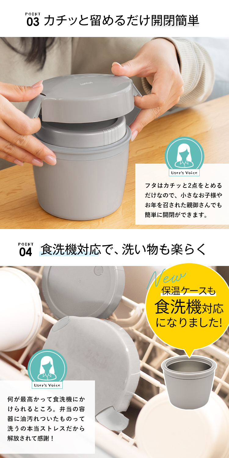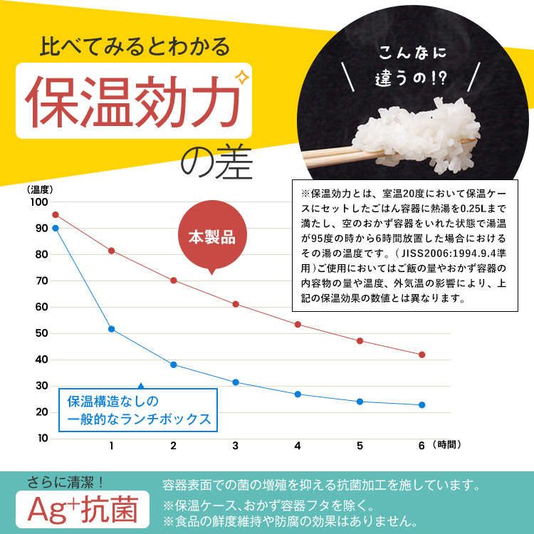 材質 : 保温ケース=ステンレス鋼(アクリル樹脂塗装) 保温ケースフタ=ポリプロピレン(中材:発泡PP断熱材) 止め具・リング・おかず容器本体・ごはん容器本体・中フタ・弁本体=ポリプロピレン パッキン・エア弁=シリコーンゴム