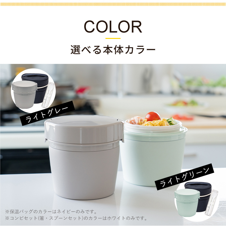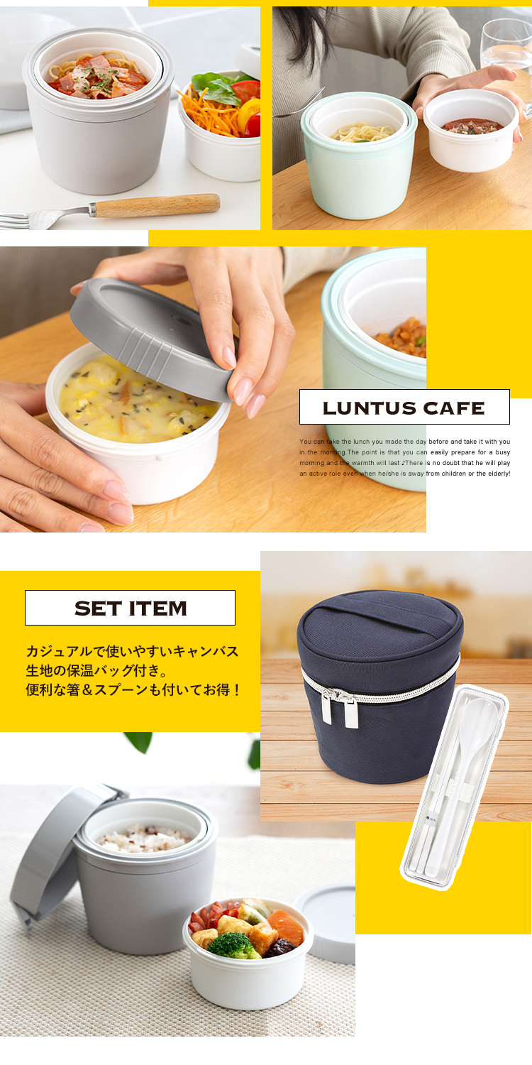 いつでもどこでも温かご飯が美味しく食べられるカフェ丼ランチ。ステンレス真空断熱構造で、保温・保冷で、中身の温度を保ちます。丼タイプなので、カレーや親子丼、パスタなど、お弁当のバリエーションが広がります。保冷もできるから、暑い夏にも冷製メニューにも。丼ぶり形状で、お子様でも食べやすく、おかずも詰めやすいので、お母さんも大助かり。食洗器にも対応、忙しい家事の短縮にも。レンジで、温め直しもできます。保温バッグと、箸・スプーンのコンビセット付き。