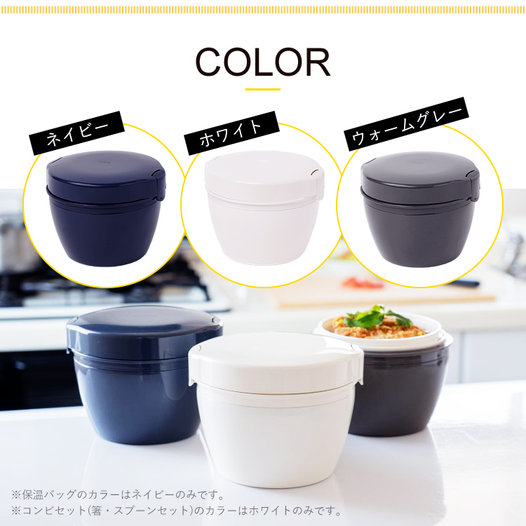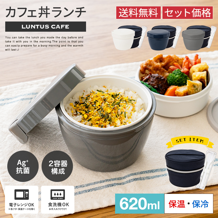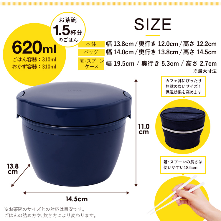 いつでもどこでも温かご飯が美味しく食べられるカフェ丼ランチ。ステンレス真空断熱構造、保温・保冷で中身の温度を保ちます。丼タイプなので、カレーや親子丼、パスタなど、お弁当のバリエーションが広がります。暑い夏にも冷製メニューにも。丼ぶり形状で、お子様でも食べやすく、おかずも詰めやすい!食洗器にも対応、忙しい家事の短縮にも。レンジで温め直しもできます。しっかり食べられる普通サイズ620ml。保温バッグと箸・スプーンのコンビセット付き。